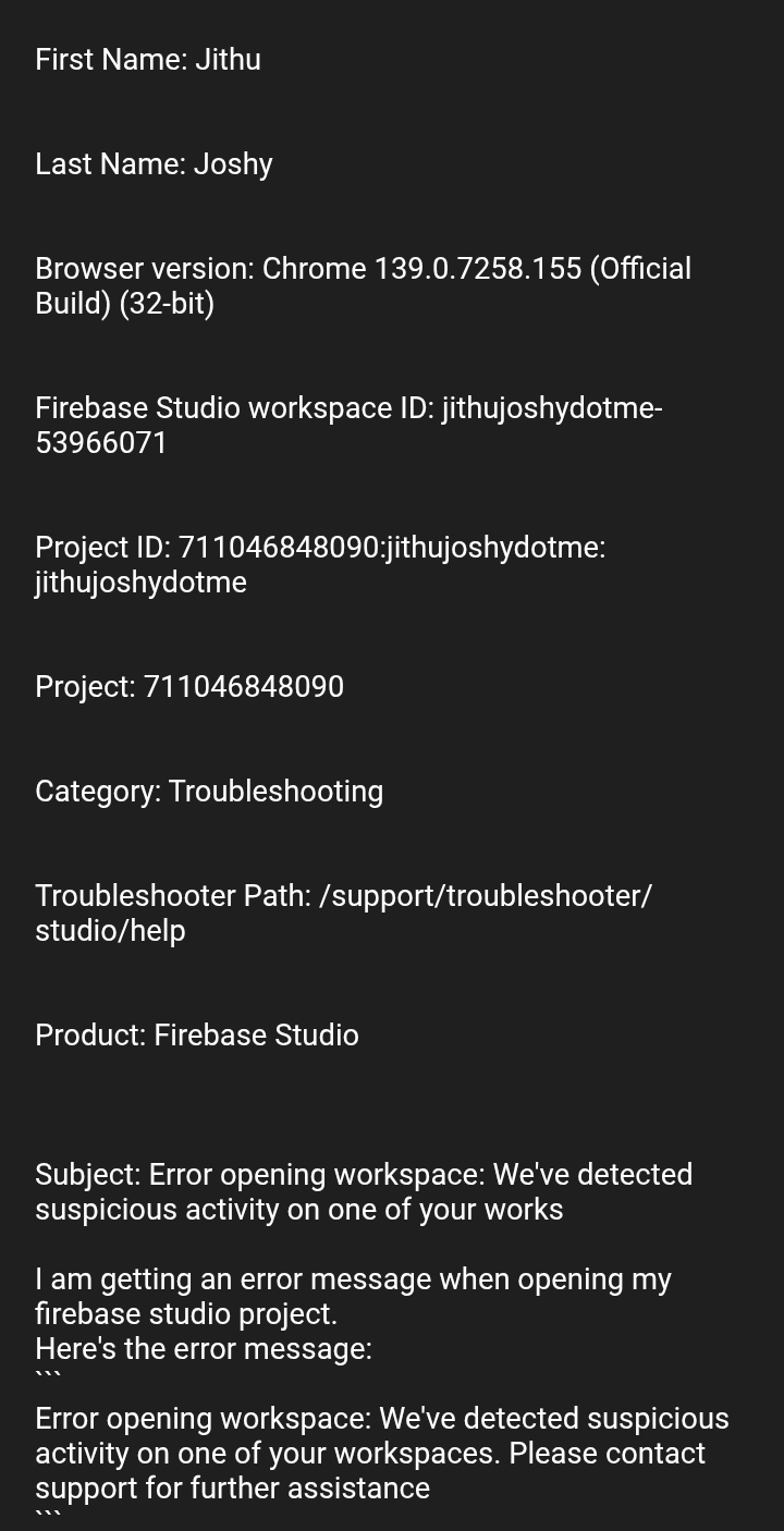 I have contacted support as per the message but it’s been almost a month now and I got not update. This issue is still not resolved. I have put in a lot of hardwork into some of those projects. Please, I don’t know what I did wrong but I need them up or at the least get my code download from firebase studio. Any help is appreciated.